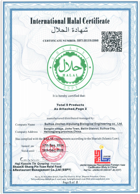綏化金晨愛普康生物工程有限公司已成功通過出口企業的HALAL認證