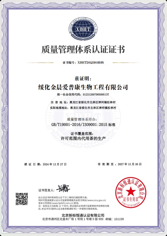 綏化金晨愛普康生物工程有限公司位于黑龍江省中南部地區的綏化市北林區,所處位置東經124度,北緯45度,位于松嫩平原的呼蘭河流域,“有寒地黑土,塞北江南”的美譽,是全國重要的商品糧基地,屬中溫帶大陸性季風氣候,四季分明,雨熱同期,冬季冰雪覆蓋,夏季降雨集中氣候溫熱濕潤。綏化金晨愛普康生物工程有限公司是一家專業從事健康養生產品研發(fā)、生產及銷售企業,公司占地總面積8000平方米,建筑面積5000平方米,公司周圍無任何污染源,是食品生產基地。公司生產車間潔凈度級別達到10萬級,同時擁有數十臺先進的生產設備及高科技檢驗儀器,從產品的原輔料、中間品、成品到銷售的全過程嚴格把關,使生產中每道工序都符合產品的高標準要求,從而保證了公司生產的每一袋產品合格,無質量缺陷。綏化金晨愛普康生物工程有限公司率先采用了企業資源ERP管理系統,肩負著養生產業的重要課題,同時又是江蘇省國家藥用植物重點實驗中心科研成果轉化的生產試驗基地,公司核心成員均為本科以上學歷。生產的產品有近五十個品種的代用茶產品,公司先后通過HALAL國際認證,編號為SSPY-201318-33849;ISO9001質量管理體系認證編號為XBH···